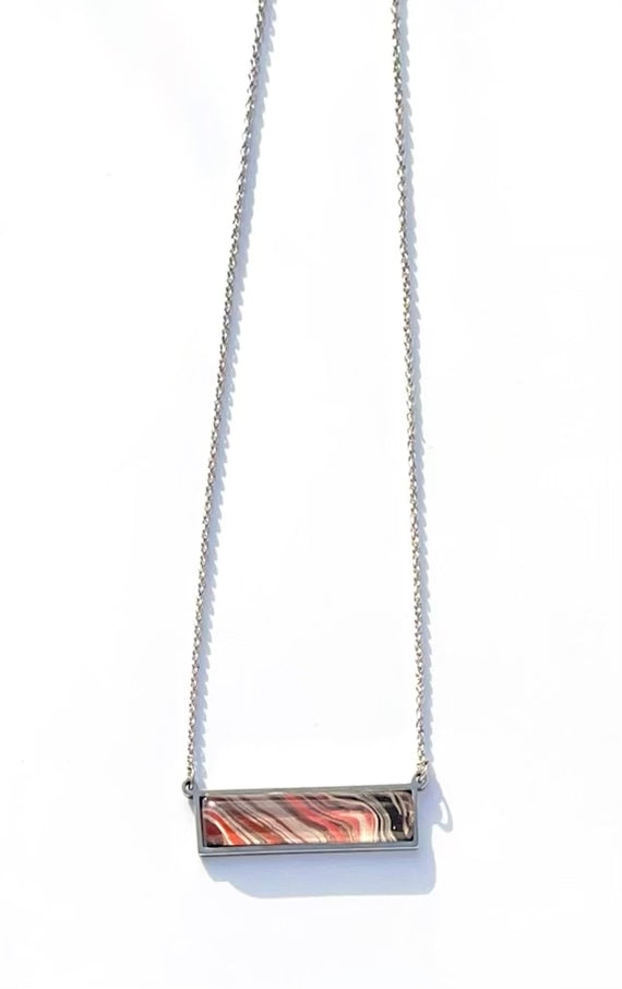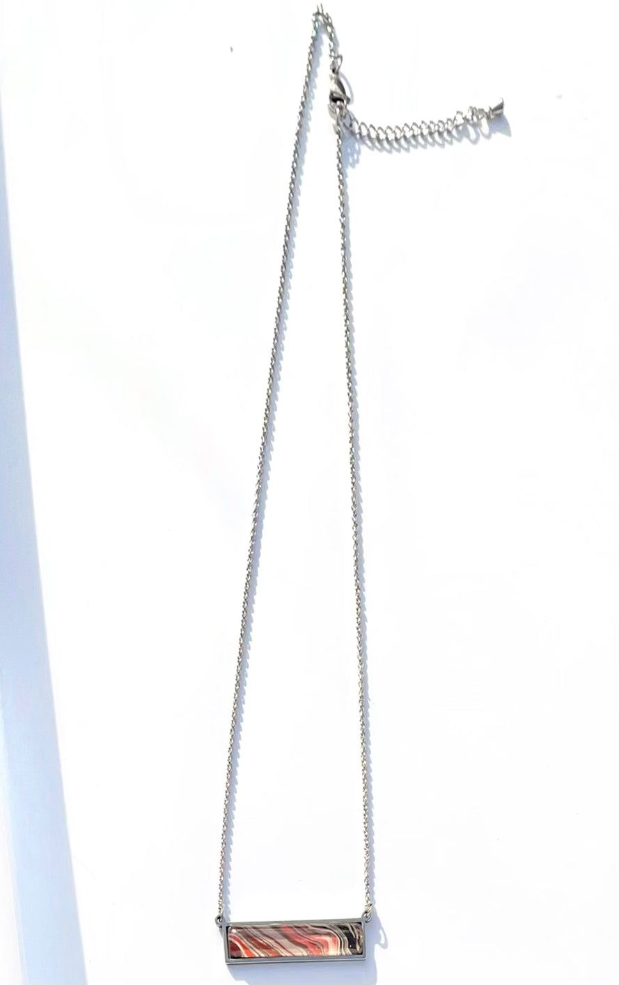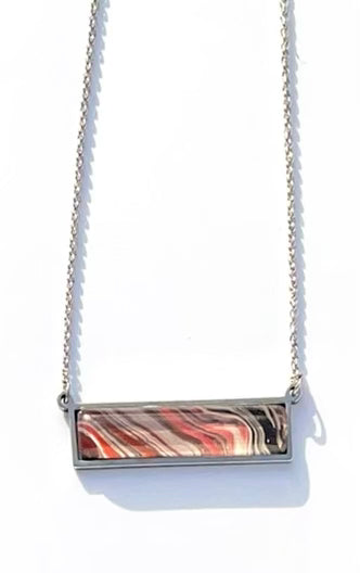 One-of-a-kind handmade swirly red, black, and brown acrylic paint skin pendant on an attached 22 inch chain!