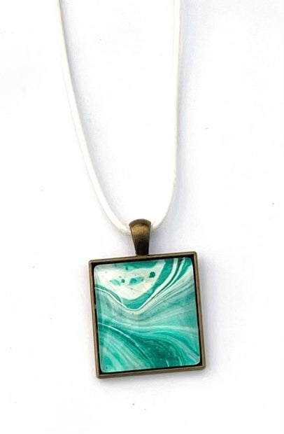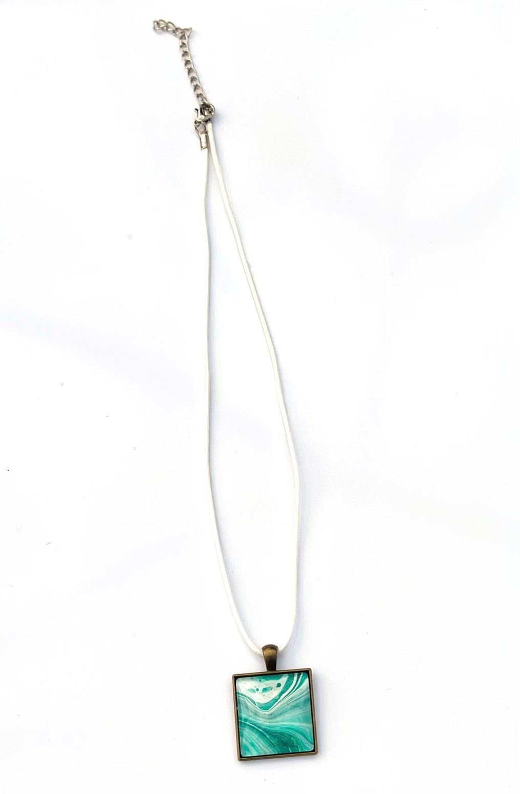 One-of-a-kind handmade metallic turquoise and white acrylic paint skin pendant on an 17 inch white cord!
