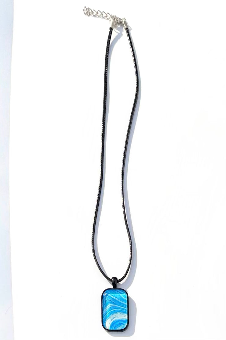 One-of-a-kind handmade blue and white swirl with a hint of gold sparkle acrylic paint skin pendant on an 18 inch black cord!