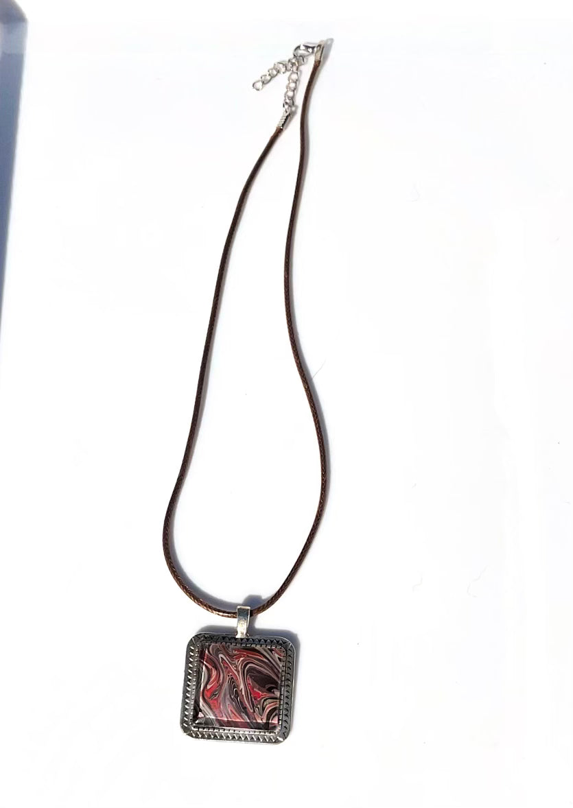 One-of-a-kind handmade swirly red, brown, and tan acrylic paint skin pendant on an 18 inch brown cord!